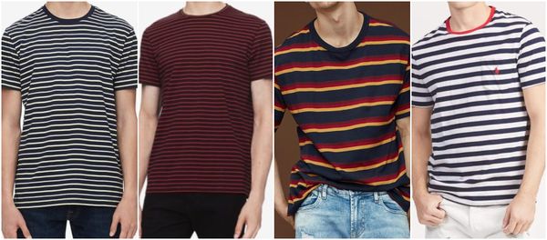 Áo thun kẻ sọc có xuất xứ từ đồng phục hải quân Pháp (còn gọi là áo Breton), nhưng sự sang trọng và thời trang của mẫu áo thun nam đẹp này là không thể phai mờ theo thời gian. Nếu bạn muốn phối trang phục theo hướng cổ điển, áo thun kẻ sọc màu xanh navy, đen hoặc đỏ là lời gợi ý hiệu quả dành cho bạn. Sọc càng dày, càng nhiều màu sắc, trang phục của bạn càng nổi bật hơn. Bạn cũng có thể bổ sung áo thun kẻ sọc tay dài và tay ngắn vào tủ đồ để có thêm nhiều sự lựa chọn cho mình. Lưu ý, người ốm hãy mặc sọc dày và kẻ ngang, còn người mập nên chọn kiểu sọc mỏng và kẻ sọc.