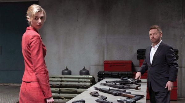 Elizabeth Debicki trong bộ trang phục đỏ mang đậm phong cách Anh Quốc